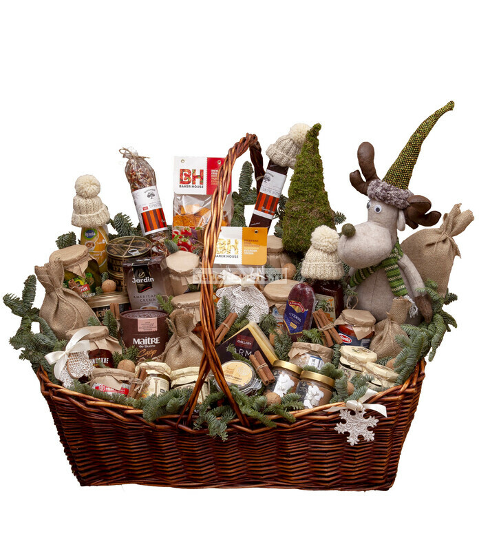 Состав: Оазис кирпич (35), Лапник (5), Лента натуральная (10), Чай в жестяной банке (1), Корзина под 501 розу (1), Мох (1), Бумага упаковочная (3), Корица (10), Мёд (1), Огурцы консервированные (1), Томаты в собственном соку (1), Ассорти из маринованных грибов (1), Конфитюр айвовый "AMARELLA" 300гр (1), Конфитюр инжирный "AMARELLA" 300гр (1), Грецкий орех (10), Джем абрикосовый "ОМК" 300гр (1), Сахар тростниковый Maitre de Sucre 270 гр (1), Вязаная шапка (3), Мешочки 15*20 см (4), Медвежатина тушеная 325г (1), Мясо оленя тушеное 325г (1), Мясо кабана тушеное 325г (1), Паштет из мяса лося с пряными травами , 180г (1), Паштет из оленины с вяленой клюквой и шпинатом , 180г (1), Масло оливковое первого холодного отжима купажированное ТМ Abril Gran Selleccion, 500мл (1), Соус BBQ (1), Соус салатный "Итальянский" 250 мл (1), Консервы из мяса краба(салатное) ст/б 200гр в солевой заливке (1), Консервы из раков волжских в солевой заливке 500гр (1), Грецкий орех очищенный,100 гр (1), Фундук очищенный,100 гр (1), Арахис в скорлупе,100 гр (1), Миндаль очищенный,100 гр (1), Соус Barilla (1), Говядина тушёная в стеклянной банке (1), Суджук ГОСТ (1), Мясо цыплёнка тушёное в стеклянной банке (1), Хлебцы Baker House Итальянские с томатом и орегано (1), Хлебцы Baker House Итальянские с семенами тыквы, оливковым маслом и морской солью (1), Сыр "Пармезан" (1), Авторская игрушка "Имбирный пряник" (5), Колбаса В СПЕЦИЯХ С/К (батон) (1), Соус бальзамический 250 г (1), Колбаса Зернистая СК (батон) (1), Кофе молотый 250 гр (1), Варенье из кизила "ARMA" 300гр (1), xM-321 Фигура 'Олень' (1), Шоколадные конфеты "Батончик" (5), Шоколадные конфеты "Мишка косолапый" (5), Шоколадный батончик Bounty минис (5), Шоколадный батончик Twix минис (5)