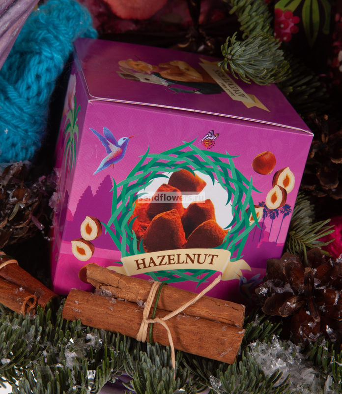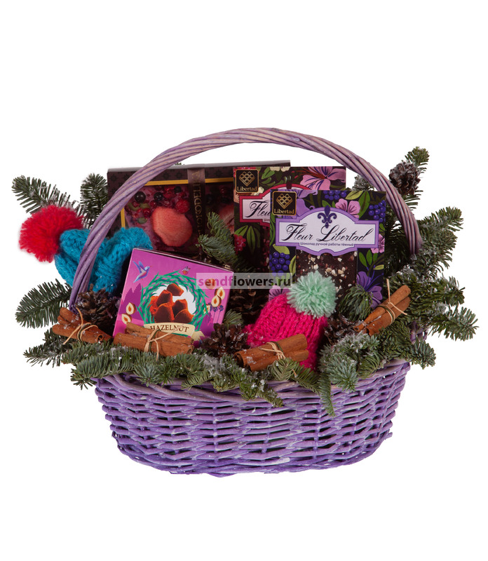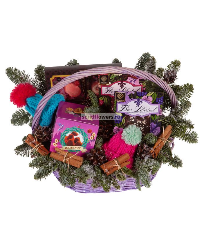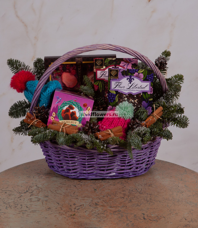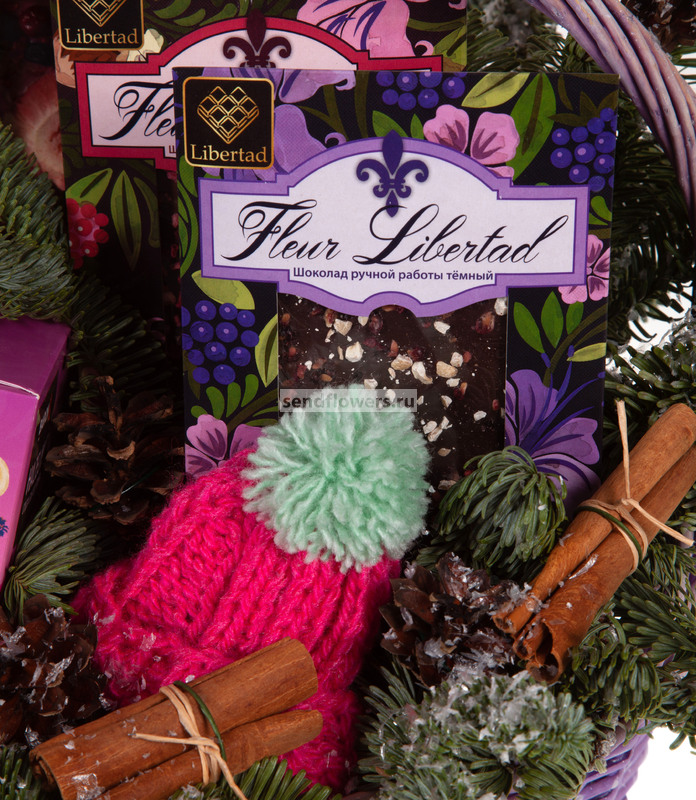 Состав: Оазис кирпич (1), Корзина малая (1), Лапник (1), Лента натуральная (3), Снег искусственный (1), Шишка натуральная (5), Корица (8), ФРАНЦУЗСКИЕ ТРЮФЕЛИ "BARON" с дробленым фундуком 150гр (1), Молочный шоколад "Флер-Де-Лис" с посыпкой из дробленного фундука и кус. сублимированной малины, 100г (1), Тёмный шоколад "Флер-Де-Лис" с посыпкой из дробленного кешью и кус. сублимированной ежевики, 100гр (1), Вязанная цветная шапка (2), Шоколад белый с украшением "Ягодный бум", 180 г (1)