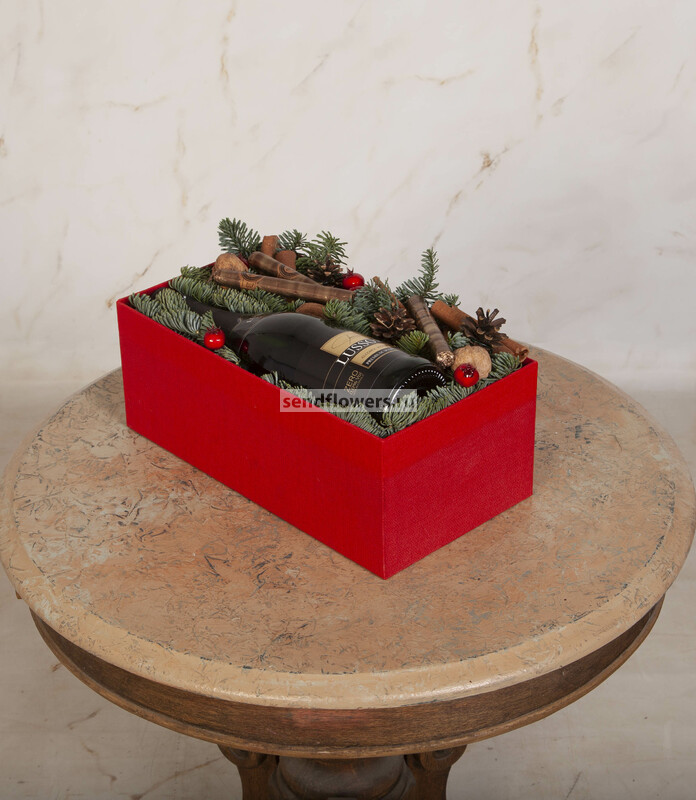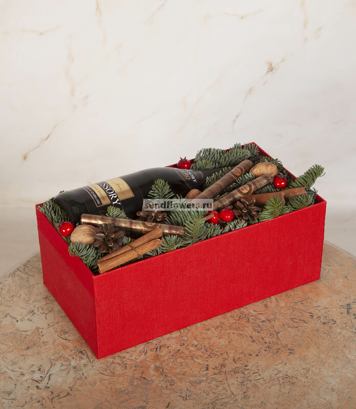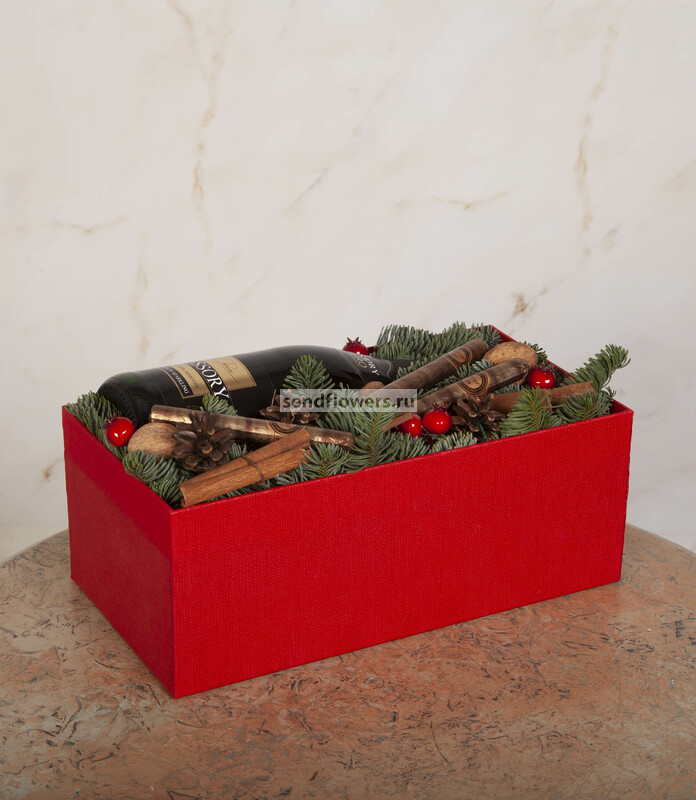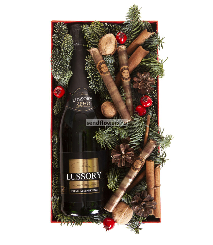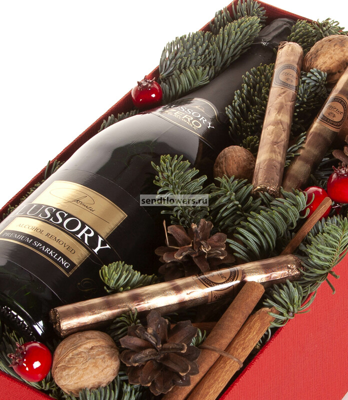 Состав: Оазис кирпич (4), Лапник (1), Лента натуральная (5), Ягоды декоративные (5), Шишка натуральная (3), Корица (8), Бумага тишью (2), Грецкий орех (3), wF-73/ 2 Коробка 'Прямоугольник' (1), Шоколад BIND "СИГАРА" с пралине (4шт*25г) 100г (1), Вино игристое безалкогольное белое, 0,75 л (1)
