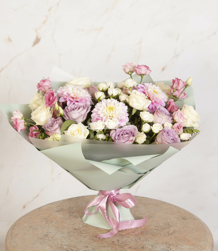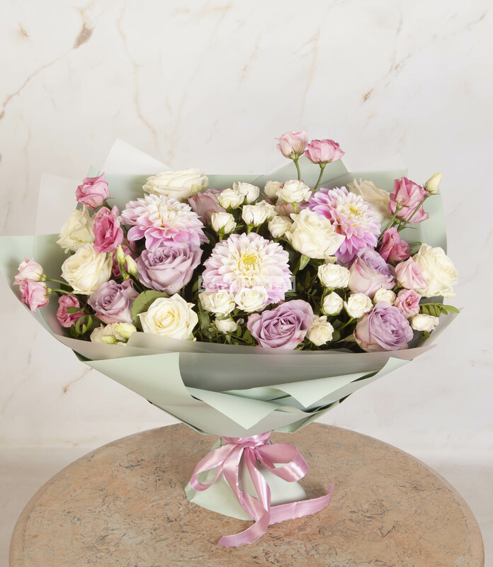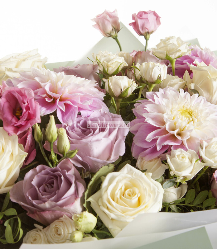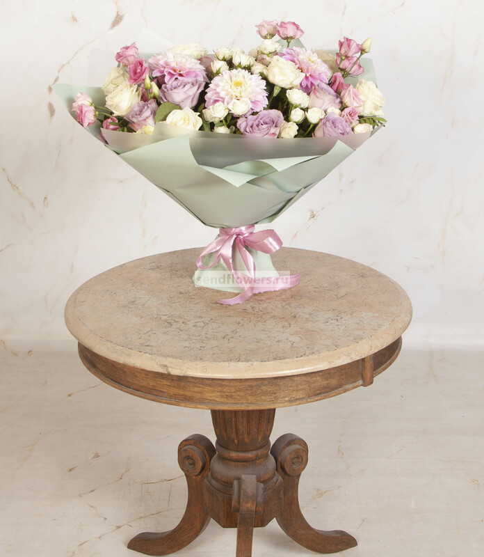 Состав: Лента натуральная (6), Фисташка (10), Роза кустовая белая (7), Роза белая (9), Эустома розовая (7), Роза "Fifth Avenue" (9), Пленка матовая (5), Хризантема одноголовая Honeymoon (5)