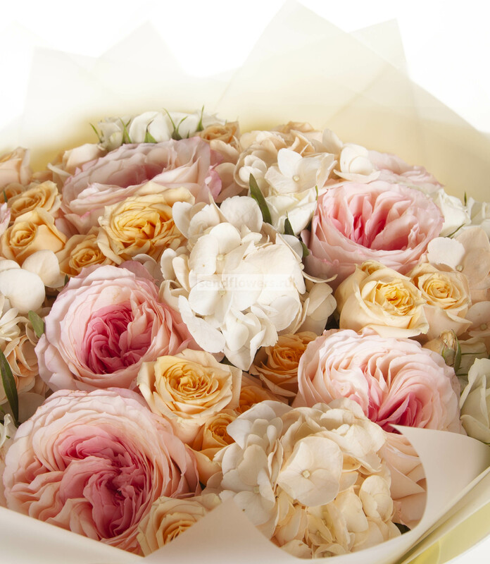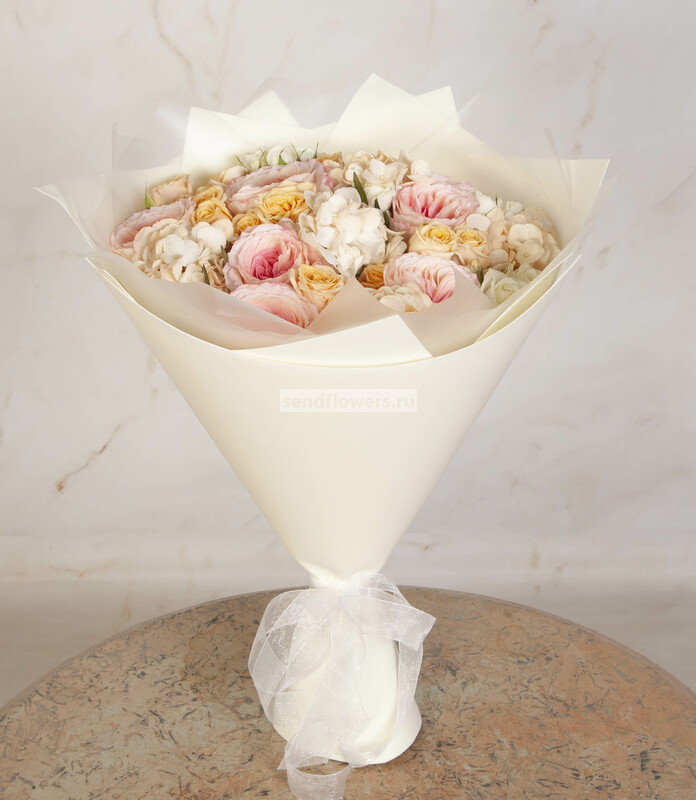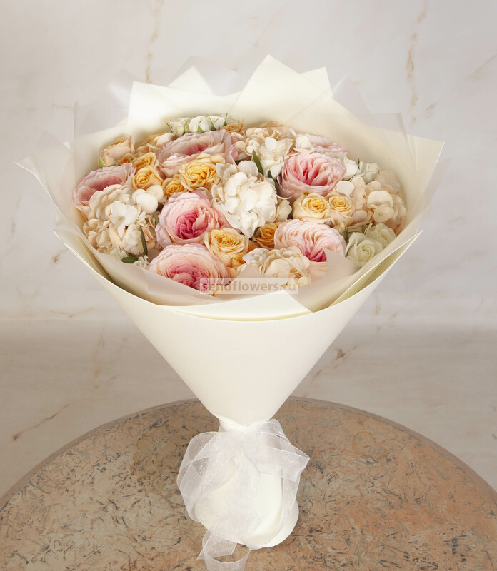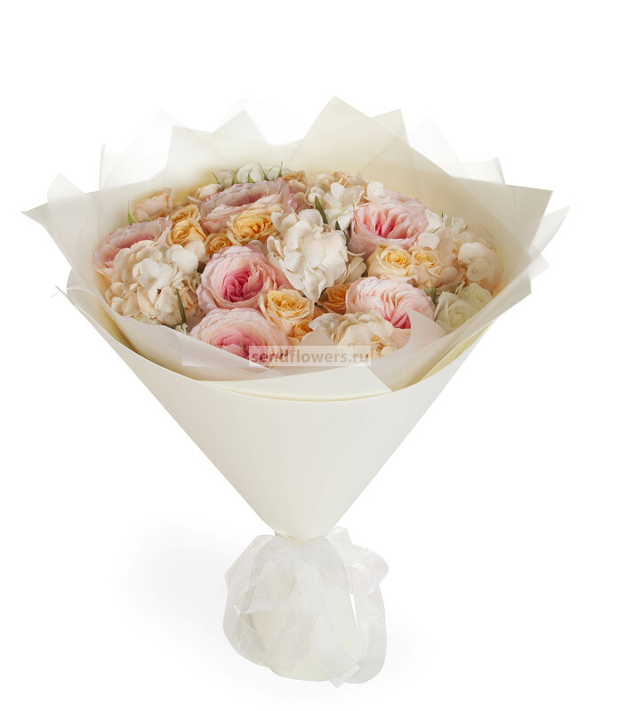 Состав: Лента натуральная (5), Фисташка (7), Роза кустовая кремовая (7), Роза кустовая белая (7), Фоамиран (2), Роза Mayras Bridal (9), Пленка матовая (3), Гортензия кремовая СО (2)