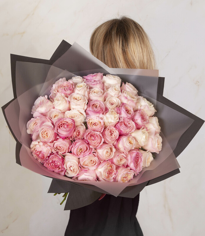 Состав: Лента натуральная (5), Роза David Austin Keira (розовая) (51), Фоамиран (3), Пленка матовая (4)