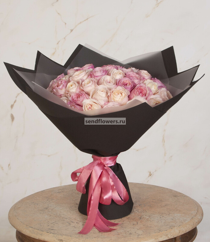Состав: Лента натуральная (7), Роза David Austin Keira (розовая) (101), Фоамиран (5), Пленка матовая (6)