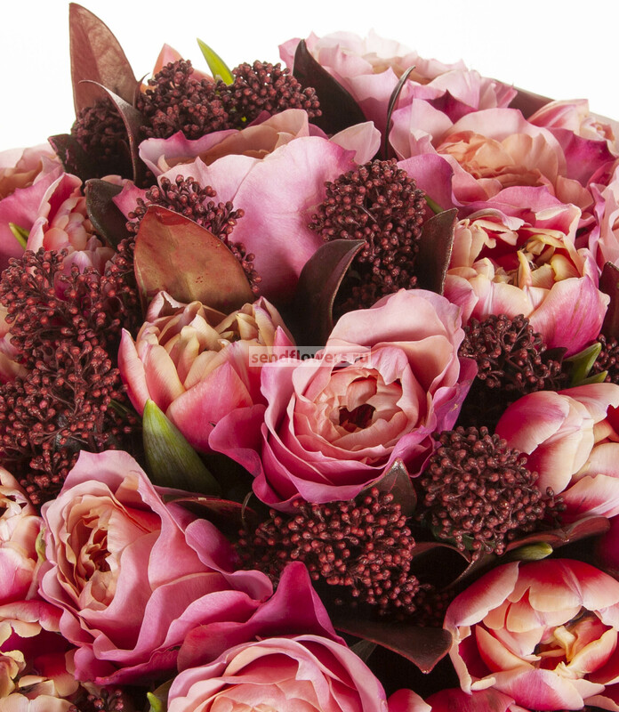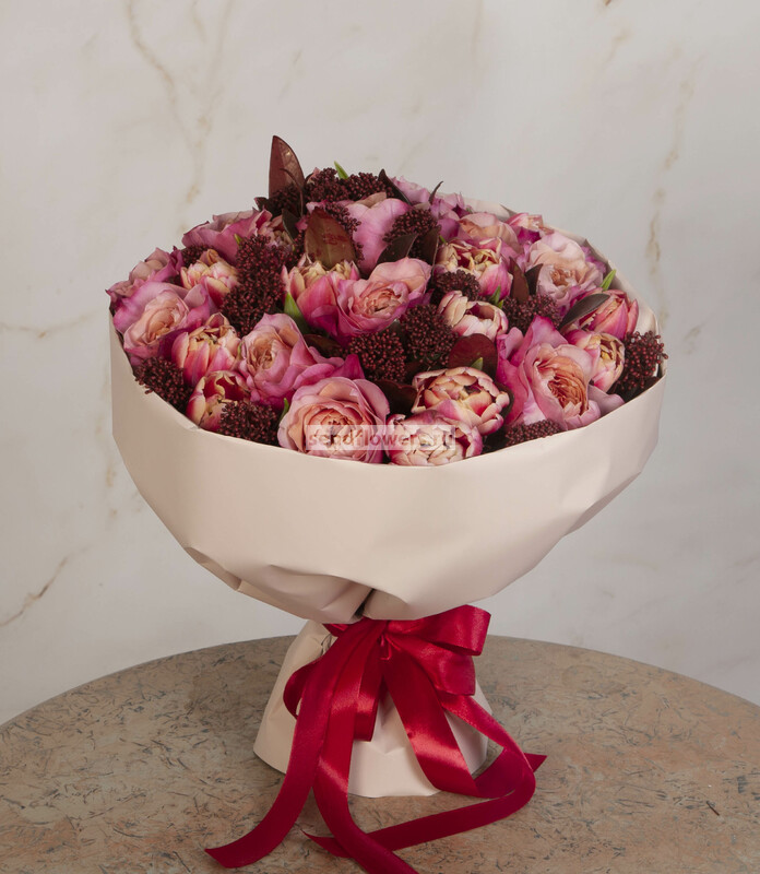 Состав: Лента натуральная (4), Скиммия красная (5), Пленка матовая (3), Тюльпан Columbus (15), Роза Miyabi (12)