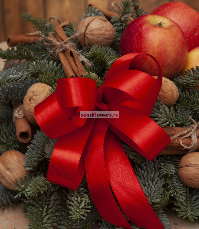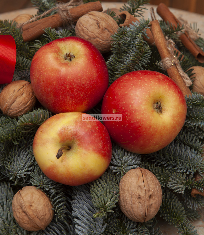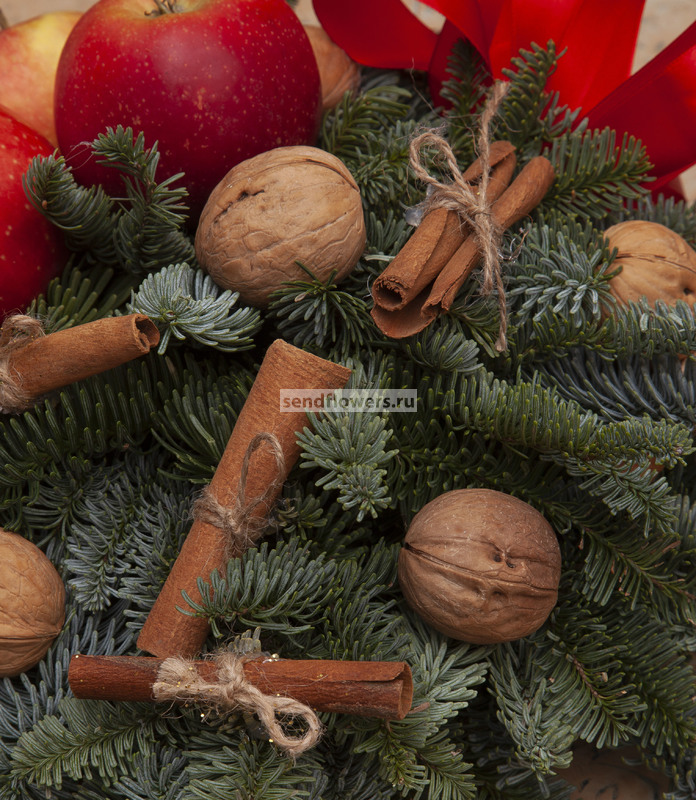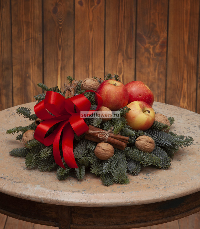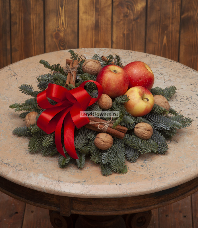 Состав: Оазис кирпич (1), Плошка (1), Яблоки (3), Лапник (1), Лента натуральная (5), Корица (8), Грецкий орех (8)