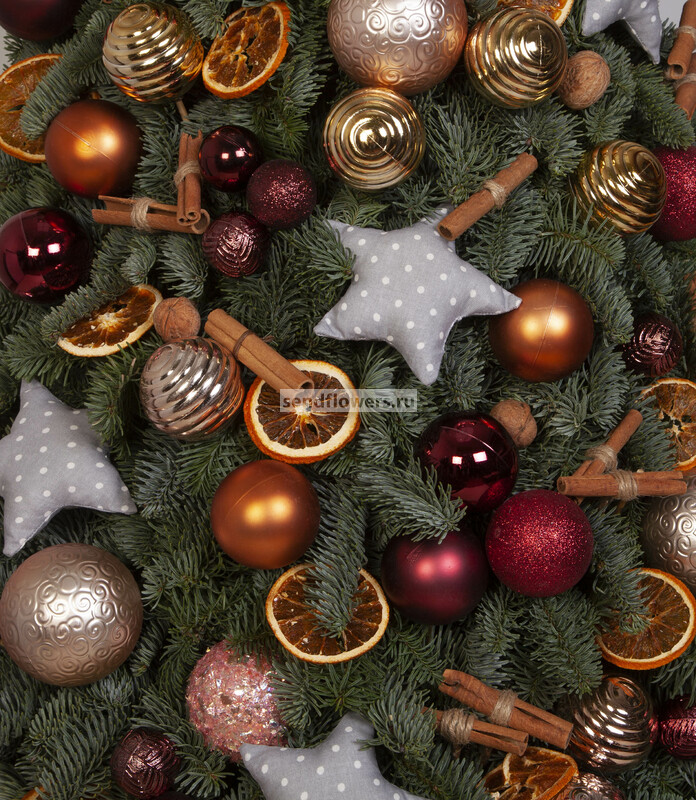 Состав: Оазис кирпич (50), Лапник (50), Шар новогодний стандартный (пластик) (80), Шарики-мини (пластик) (90), Корица (70), Сухофрукты (60), Грецкий орех (60), Кашпо пластик 12л (1), Шитая игрушка "Звёздочка" (серая) (9)