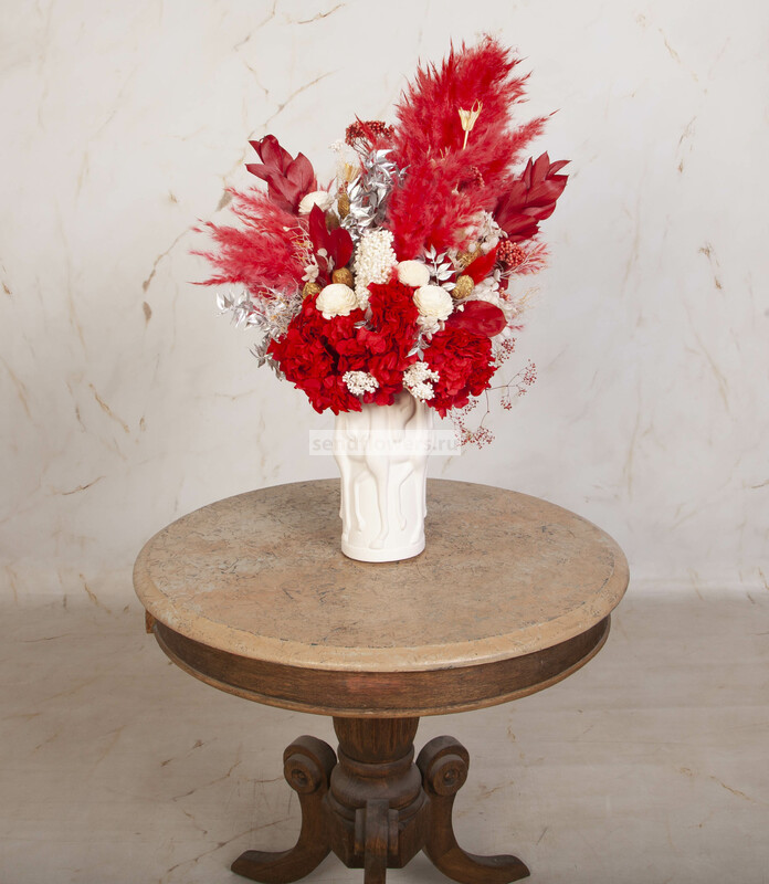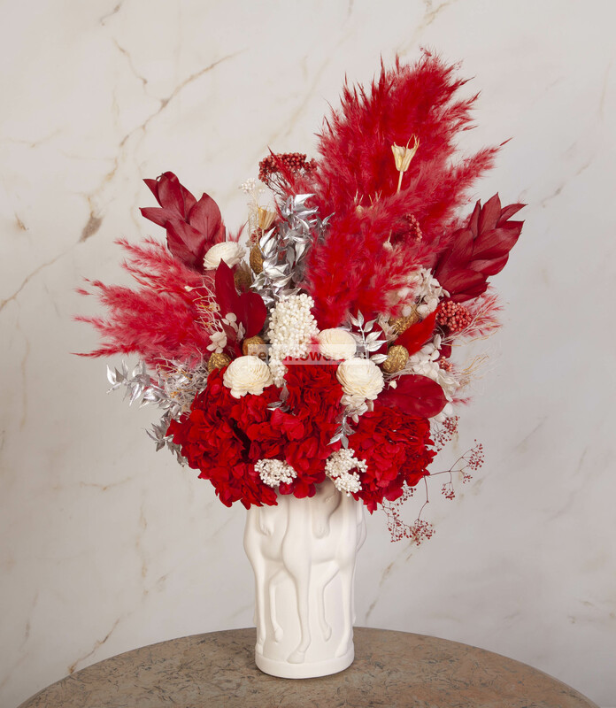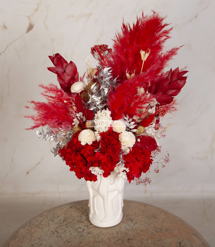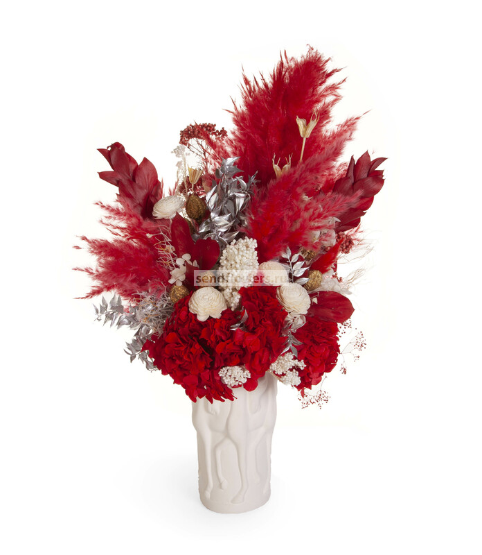 Композиция ручной работы из стабилизированных цветов и сухоцветов. Доставляется в подарочном пакете. Высота-60 см, ширина-27 см, длина-40 см.